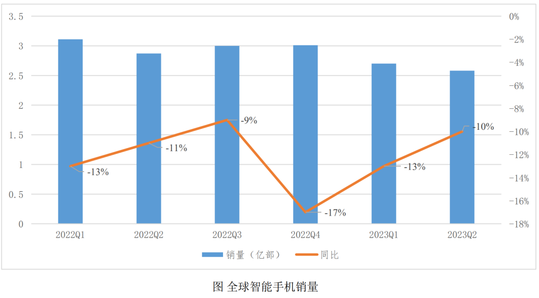 根據CANALYS的統計數據顯示:2023年第一季度全球智能手機銷量2.70億部,同比下降13%,第二季度銷量2.58億部,同比下降10%,上半年總體銷量5.28億部,同比下降12%。